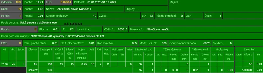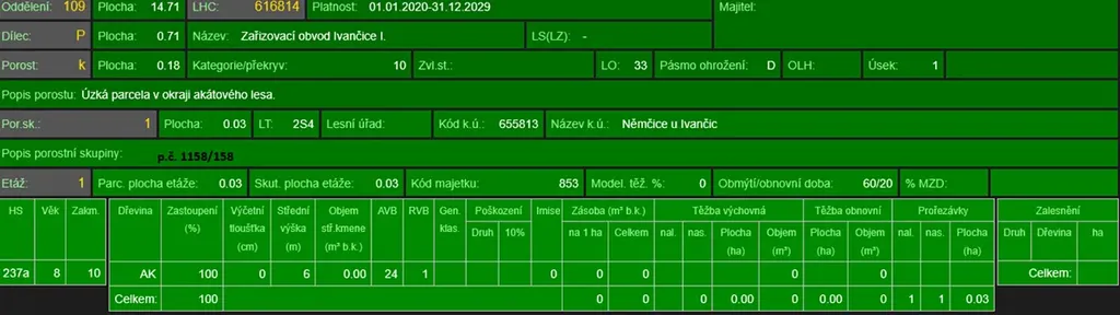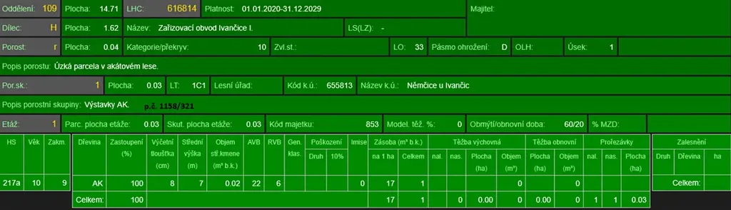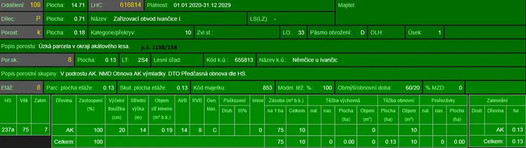 - p.č. 1158/158 vedená jako lesní pozemek o celkové výměře 1 832 m2, z toho vlastníme podíl 2/3 tedy 1 221 m2 (stáří lesa 81, 21 a 14 let - zastoupení dřevin akát),