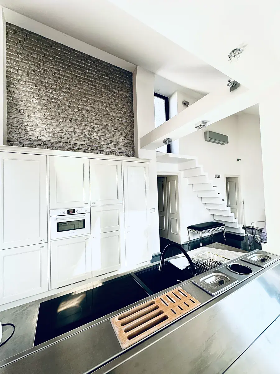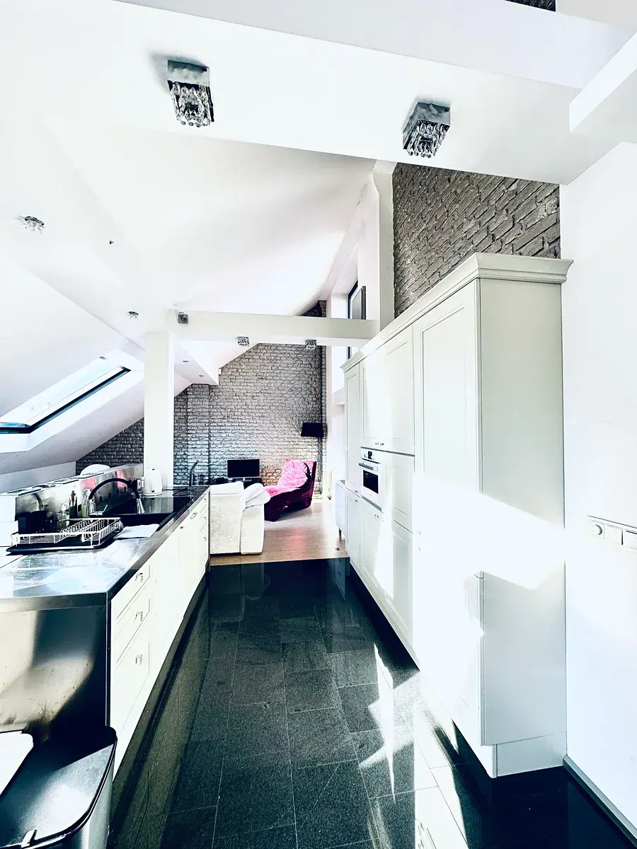 Součástí bytu je veliká střešní terasa s výhledem do klidné části Prahy a balkón. V bytě je mnoho zájímavých prvků, včetně vyhřívané podlahy a velikého kuchyňského ostrova.