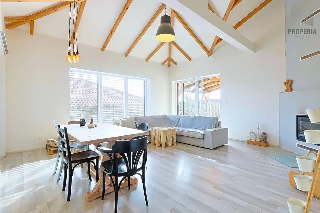 Dominantou domu je prostorný obývací pokoj s jídelnou (31 m²) s kuchyňským koutem 8,4 m² a zvýšeným stropem umocňující bydlení v domě. Dům nabízí tři samostatné pokoje, koupelnu s WC a samostatné WC