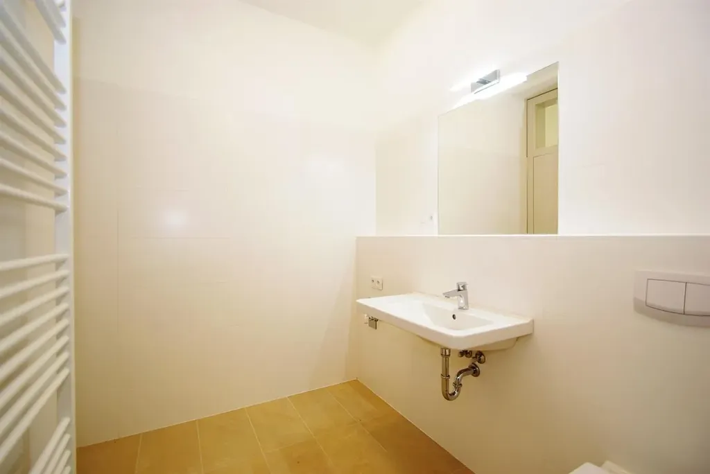 Nezařízený interiér bytu dispozičně nabízí vstupní chodbu (2,26 m2), prostorný obývací pokoj (21,31 m2) s moderním kuchyňským koutem s vestavěnými spotřebiči (lednice, elektrická varná deska, trouba, myčka, digestoř), samostatnou ložnici (14,11 m2), stylovou koupelnu (6,78 m2) s proskleným sprchovým koutem, umyvadlem a oddělenou toaletou. K bytu náleží sklepní kóje.