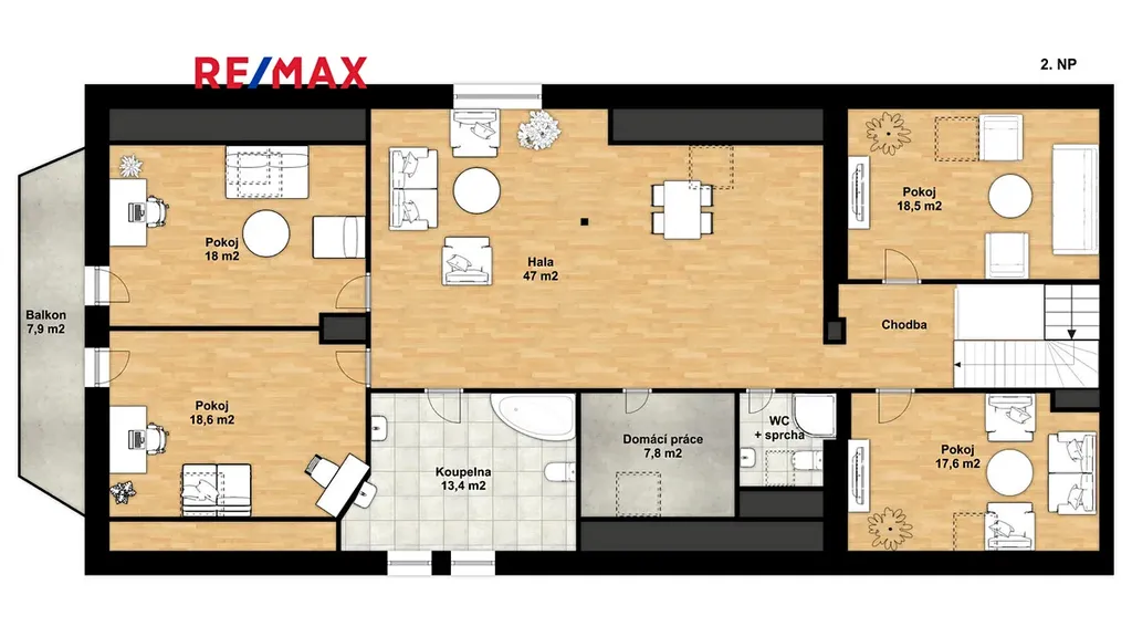 V 2.NP se nachází 4 prostorné pokoje, koupelna s wc a sprchovým koutem, pracovnou a velkou koupelnou s rohovou vanou, přípojkou na pračku, dvojumyvadlem, bidetem a toaletou. V otevřeném prostoru lze vybudovat kuchyňský kout, pro který jsou instalace připraveny.