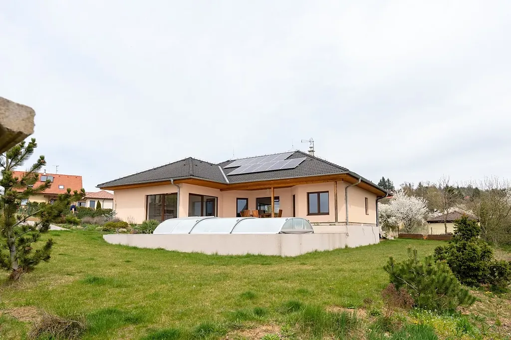 Atraktivní nabídka prodeje velmi hezkého a útulného přízemního atriového rodinného domu s venkovním bazénem a fotovoltaickými panely na střeše domu, obec Ondřejov, okres Praha-východ, ulice V Lukách. Součástí zděného a částečně podsklepeného (cca 70 m2) rodinného domu s užitnou plochou 151 m2 je prostorný obývací pokoj s kuchyní a jídelnou (60 m2) a výstupem na dvě terasy (západní k venkovnímu bazénu a východní pro poklidné ranní snídaně), tři ložnice, kde každá má výstup na terasu (16, 11 a 11 m2), koupelna s vanou, sprchou a umyvadlem (10 m2), samostatná toaleta, prádelna s dalším WC a umyvadlem, velká pracovna, která lze předělat na ložnici (25 m2) s výstupem na hlavní terasu, spíž (1,5 m2) a vstupní zádveří (4 m2). Součástí domu je také sklep o ploše 90 m2. Vytápění domu je elektrické vodovodní podlahové s možností ohřevu přes výměník v krbu, který je umístěný v obývacím pokoji. Celková rozloha slunného pozemku činí 1 103 m2, zastavěná plocha je 180 m2. Na střeše domu je deset fotovoltaických panelů na výrobu elektřiny s nástěnným boxem na dobíjení elektromobilů. Parkování je na zpevněné ploše před vstupem do domu pro minimálně 3 osobní vozy. Dům má vlastní studnu a kanalizace je svedena do vlastní čističky se zásobníkem na vodu. Napojení na sítě je možné na konci ulice. Krytý venkovní bazén s protiproudem a slanou vodou má rozměr 6 x 3 m, hloubku 1,5 m. Příjemným prvkem jsou 3 terasy u domu o celkové ploše 70 m2. PENB B. Zahrada je jen částečně založena a umožňuje tak novým majitelům dotvořit si ji dle svých představ. U vstupu na pozemek je skalka v provence stylu, dále je na zahradě jabloň, dvě třešně, maliny, angrešt, lískový ořech. Dům leží v klidné rezidenční části Ondřejova v blízkosti luk a vstupu do přilehlého lesa. Obec Ondřejov rozkládající se na jižních svazích hory Pecný se nachází 15 kilometrů od města Říčany, 35 km od Prahy a 6 km od Senohrab. Ondřejov je dobře dostupný i PID (např. přímou autobusovou linkou k metru trasy C Háje nebo do Stránčic a poté vlakem směr Praha hl. n.). V obci, jejíž historické centrum je městskou památkovou zónou, je nová moderní základní škola, dvě mateřské školy (státní i soukromá), cukrárna, kavárna, lékárna, dva obchody s potravinami, hospoda a oblíbená restaurace s pizzerií. Dále je zde skvěle fungující sportovně kulturní centrum s rozmanitou nabídkou aktivit, kroužků a lekcí pro děti i dospělé. Nad Ondřejovem je také známá hvězdárna – pracoviště Astronomického ústavu AV ČR. Vedení obce pravidelně organizuje různé společenské akce, na kterých se zdejší obyvatelé rádi schází a baví. Nákupem domu, který je k nastěhování ihned, nezískáváte jen nové bydlení, ale útulný domov s přátelskými sousedy.