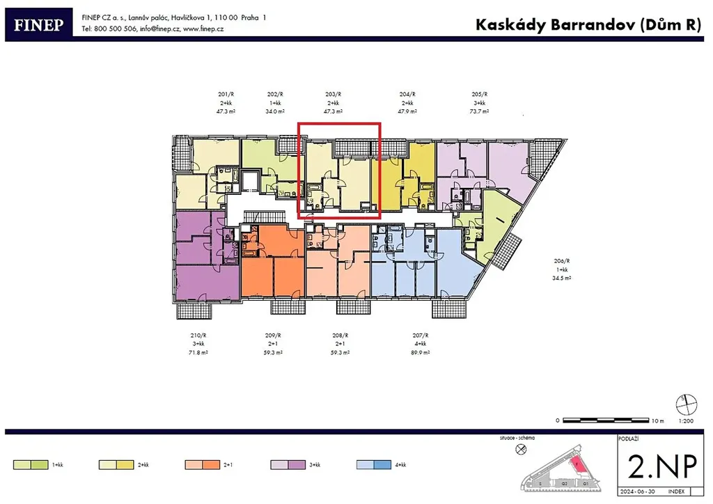Bytová jednotka 2+kk o velikosti 47,26 m2 + lodžie 7 m2 se nachází ve 2. nadzemním podlaží (z celkových šesti) s orientací na sever.