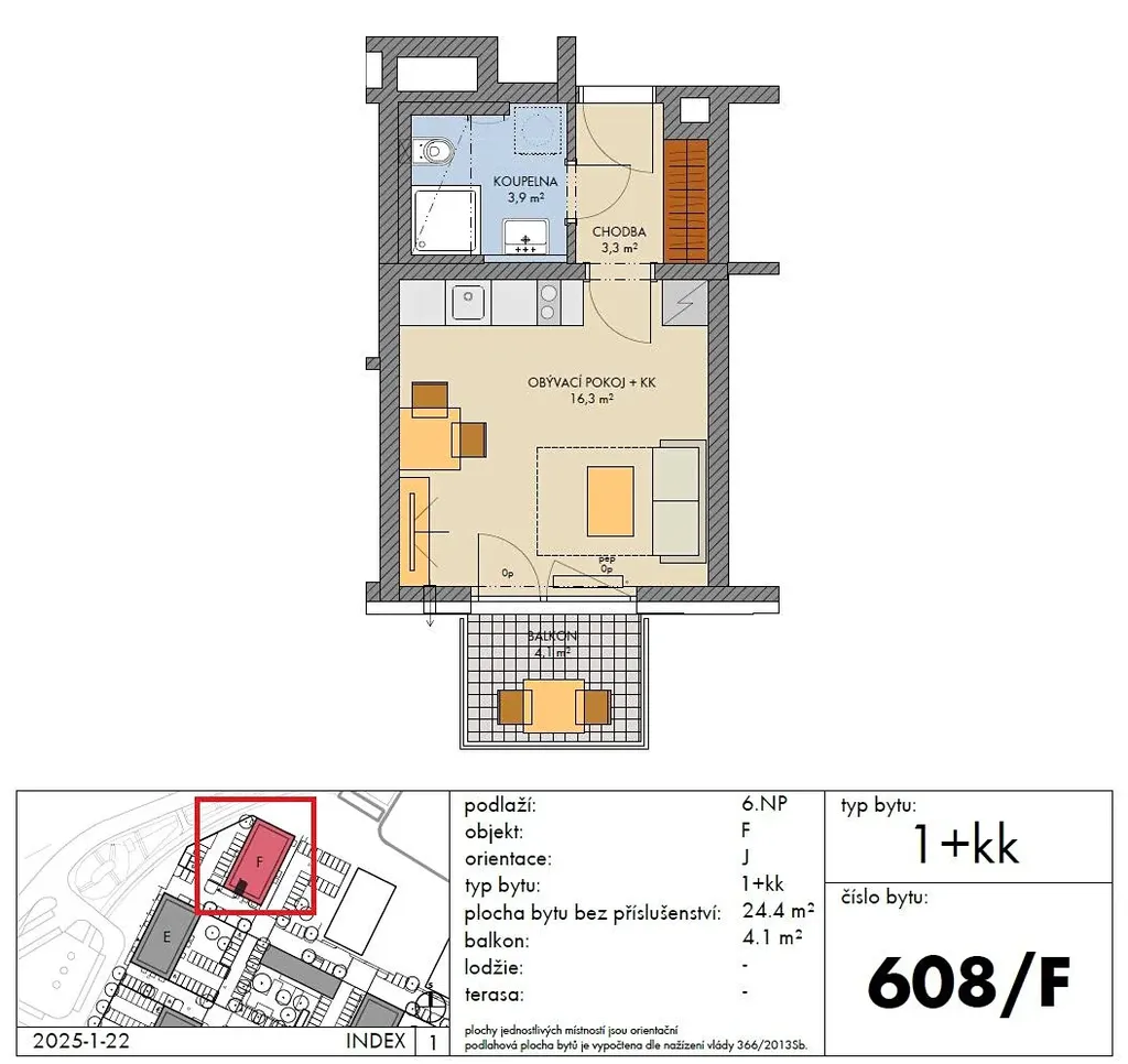 Byt 1+kk o velikosti 24,4 m2 + balkon 4,1 m2 se nachází v 6. nadzemním podlaží (z celkových sedmi) s orientací na jih.