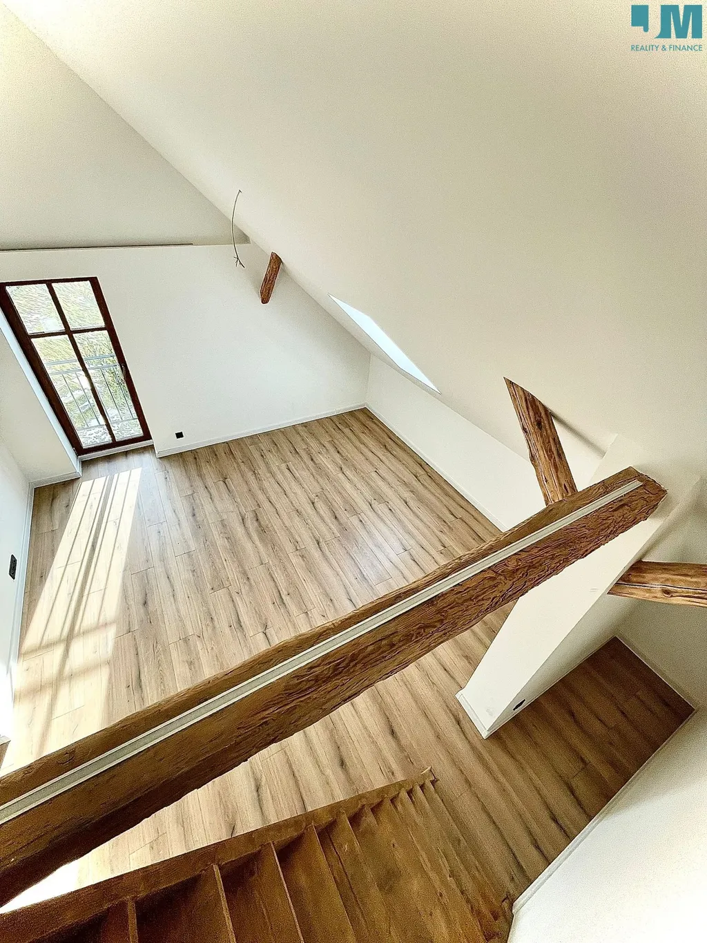 Přiznané trámy, podkrovní okna a dřevěné prvky vytvářejí příjemnou atmosféru horského bydlení s moderním standardem.