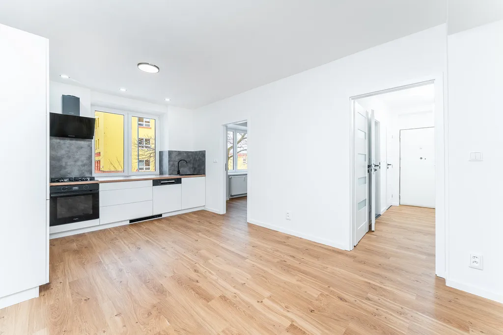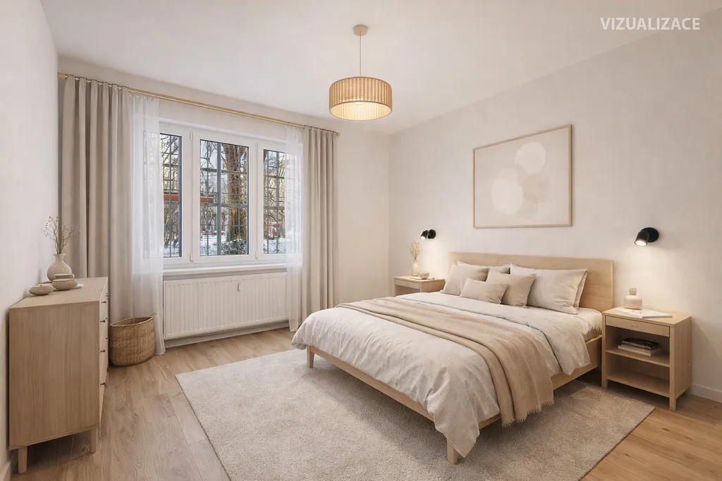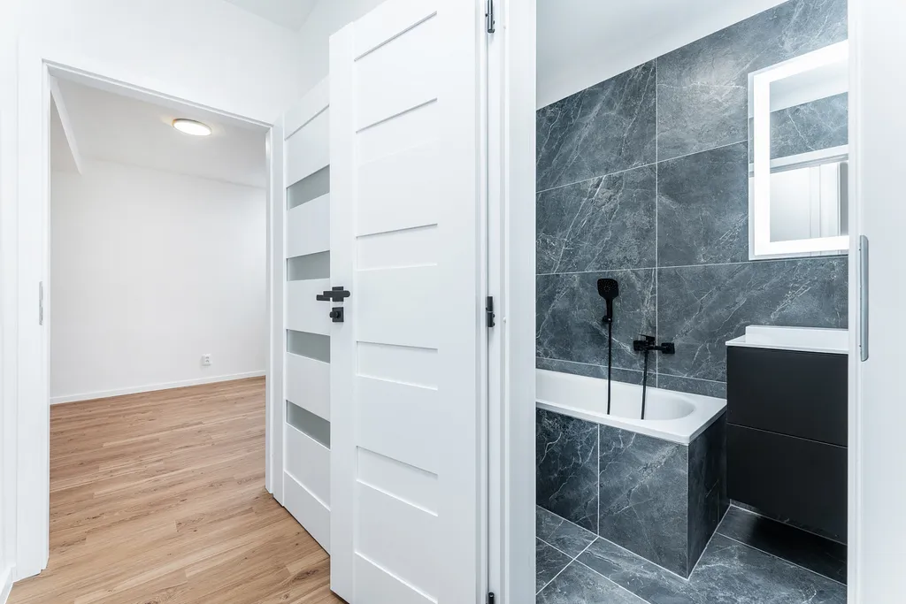 Při vstupu do chodby, kde jsou vestavěné skříně vyrobené na zakázku, je vpravo oddělené WC, dále krásná koupelna s vanou a velkoformátovým moderním obložením i dlažbou. Přímo z chodby se vchází do obývacího pokoje s kuchyňským koutem, opět moderně vybavená kuchyňská linka, vyrobená na míru, včetně lednice s mrazákem, sklokeramickým sporákem, horkovzdušnou troubou, digestoří, mikrovlnou troubou a myčkou. Veškeré spotřebiče jsou nepoužité v záruční době. Vše dokonale ladí s podlahou z vinylu, novými dveřmi a obložkami. Přípojky jsou nové, včetně radiátorů. Z této místnosti se vchází do dvou oddělených ložnic.