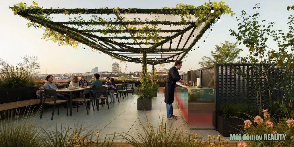 * komunitní střešní terasu s výhledem na město