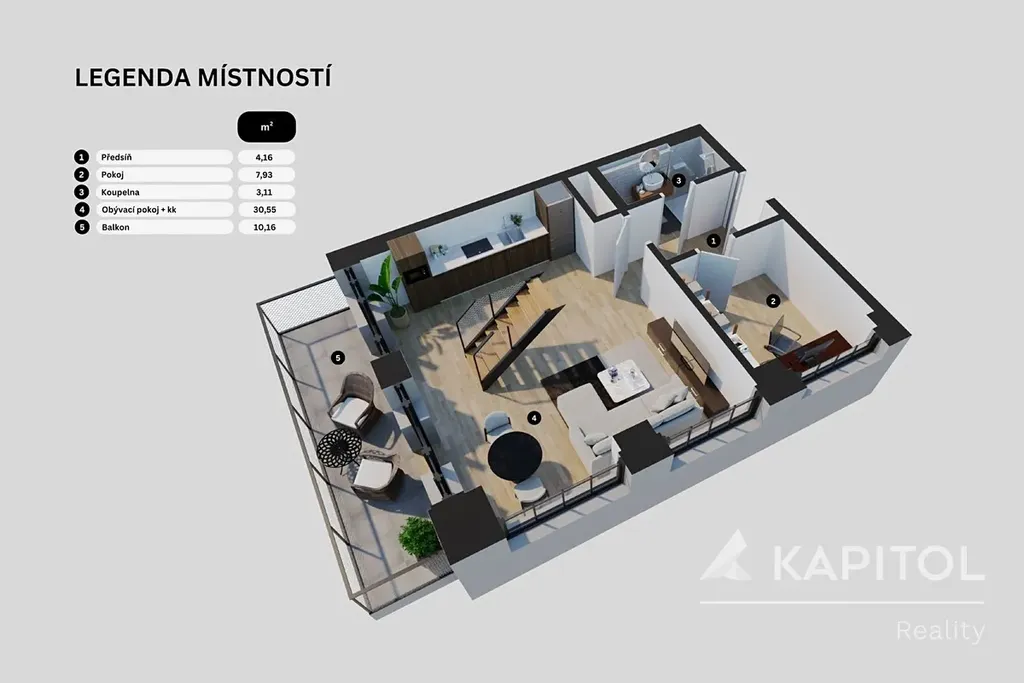 •prostorný obývací pokoj s kuchyňským koutem (30,55 m²)