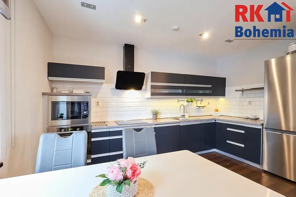 - Moderní kuchyňská linka je plně vybavena vestavnými spotřebiči: indukční varnou deskou, elektrickou a mikrovlnnou troubou, digestoří a nechybí ani integrovaná myčka nádobí.
