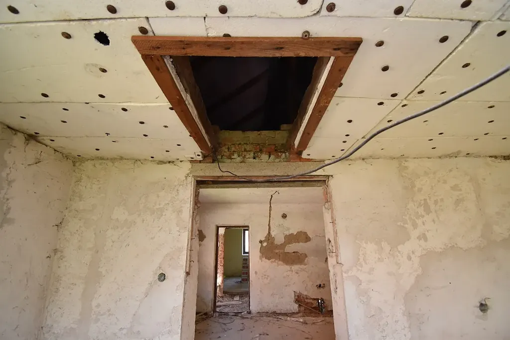 Co se týká prostoru v podkroví, je možné ho využít jako mezonetový prostor na spaní, případně všechny stropy vybourat, celý prostor otevřít a mít designový strop s přiznanými trámy, jelikož výška střechy není tak vysoká pro využití plnohodnotného pokoje. První fotografie je návrh vizualizace, jak by dům mohl vypadat po dokončení.