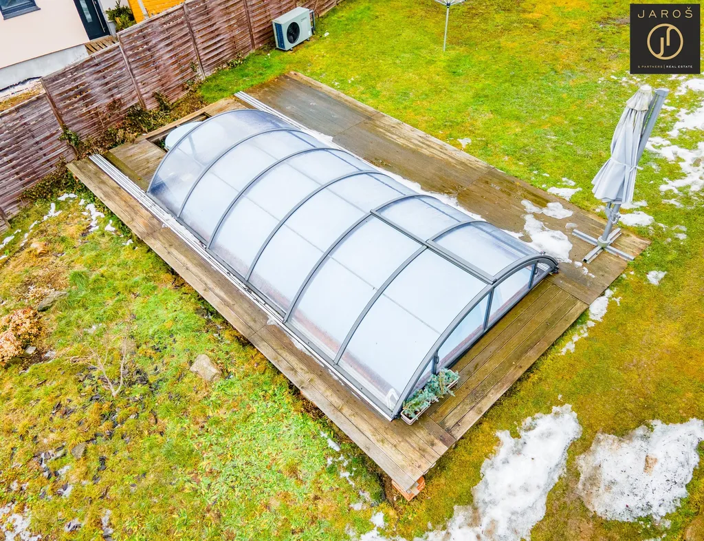 Na zahradě se vzrostlými ovocnými stromy je vybudován bazén o rozměrech 6 × 3 m se slanou vodou a ohřevem tepelným čerpadlem, který minimalizuje nároky na údržbu. V horní části pozemku stojí nová dřevěná chatka vhodná jako zázemí pro relaxaci, letní kuchyň (je zde elektroinstalace), nebo uskladnění věcí.