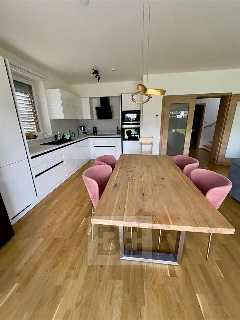 Nabízíme Vám pronájem patrového rodinného domu s obytnou plochou 144 m² a zahradou 350 m², v ulici Borová - obec Zlonín. Přízemí se sestává ze vstupní chodby, koupelny se sprchovým koutem a toaletou, k dispozici je pračka a sušička, pokoje pro hosty s vybavením viz foto, komory v prostoru pod schodištěm a obývacího pokoje s kuchyňským koutem plně vybaveným vestavnými spotřebiči. Zůstává americká lednice a ostatní vybavení vyjma TV, pohovky a konferenčního stolku. Z obývacího pokoje lze vejít na terasu 17 m² s elektrickou markýzou a zastíněním, dále na zahradu 350 m², s nádrží na dešťovou vodu o objemu 14 m³. Po schodišti vyjdeme do prvního patra, které se sestává z haly, samostatné toalety, koupelny s vanou, dvou pracoven, které zůstanou prázdné, pod dohodě lze nechat stolky a křesla, ložnice s prostornou skříní a dětského pokoje. K domu náleží garáž 37 m². Zde zůstávají regály, druhá lednice, gril, změkčovač vody a zahradní vybavení. V oknech nainstalovány předokenní žaluzie, chytrá domácnost ovládána mobilní aplikací, druhý vodoměr na užitkovou vodu, která je levnější o 50%.