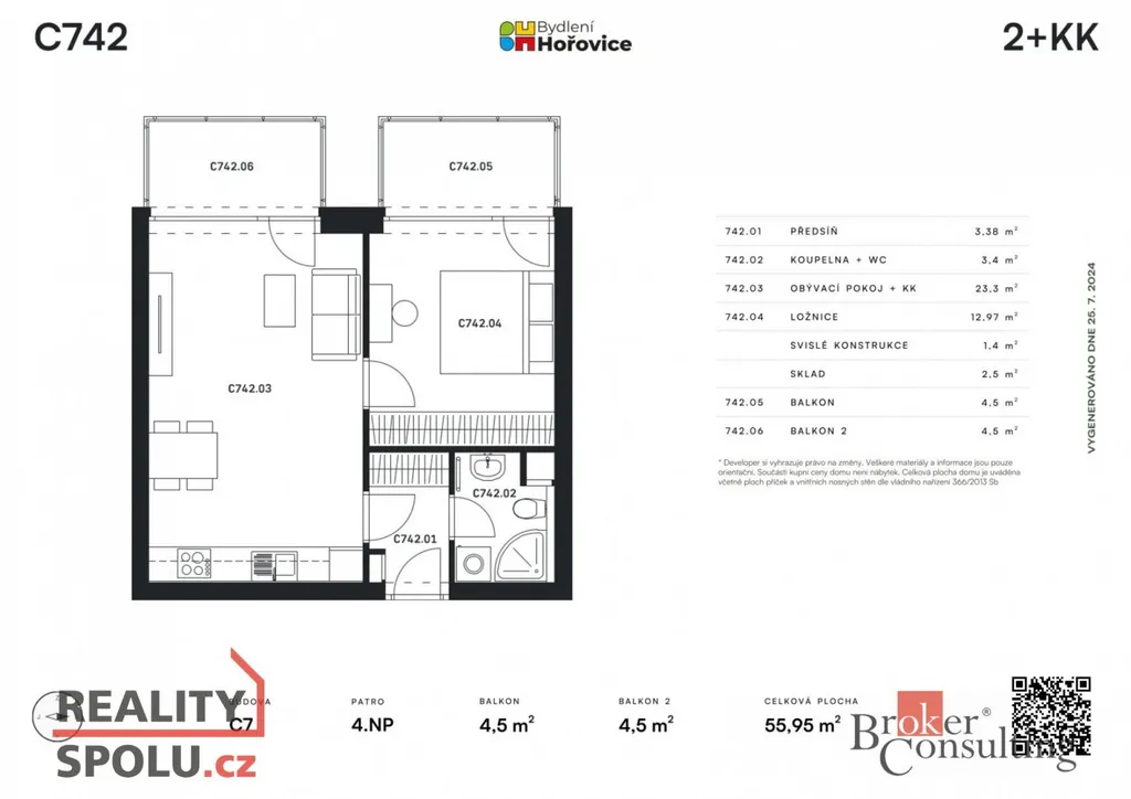 Byt o celkové ploše 56 m² se nachází ve čtvrtém patře s výtahem. Dispozice bytu zahrnuje kuchyňskou linku se spotřebiči spojenou s obývacím pokojem, předsíň, ložnici, koupelnu se sprchovým koutem a toaletou. Z každé místnosti je samostatný vstup na balkon.