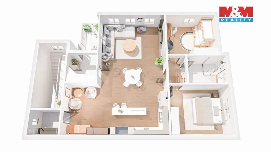 Byt se nachází ve 2. podlaží domu bez výtahu a nabízí velmi praktické dispoziční řešení. Dominantou je velký, světlý obývací pokoj propojený s kuchyňským koutem, který vytváří otevřený a vzdušný prostor ideální pro rodinný život. Součástí bytu jsou dvě samostatné ložnice, komora pro pohodlné uskladnění věcí a chodba s přímým vstupem na menší terasu – ideální místo pro ranní kávu nebo večerní odpočinek.