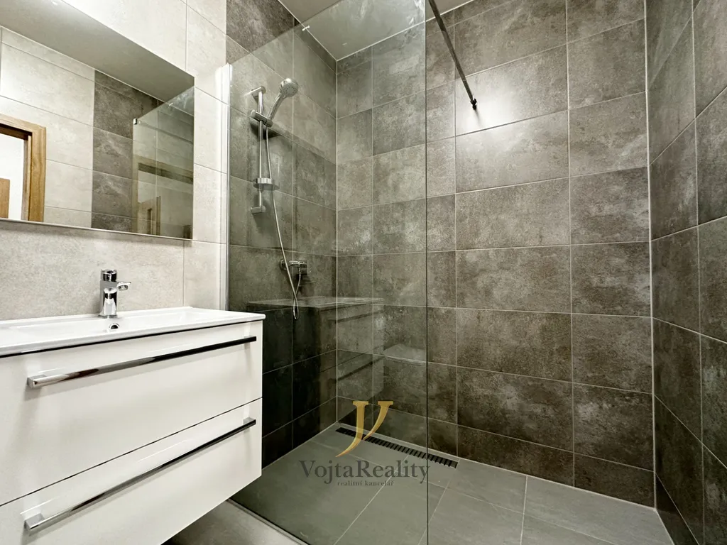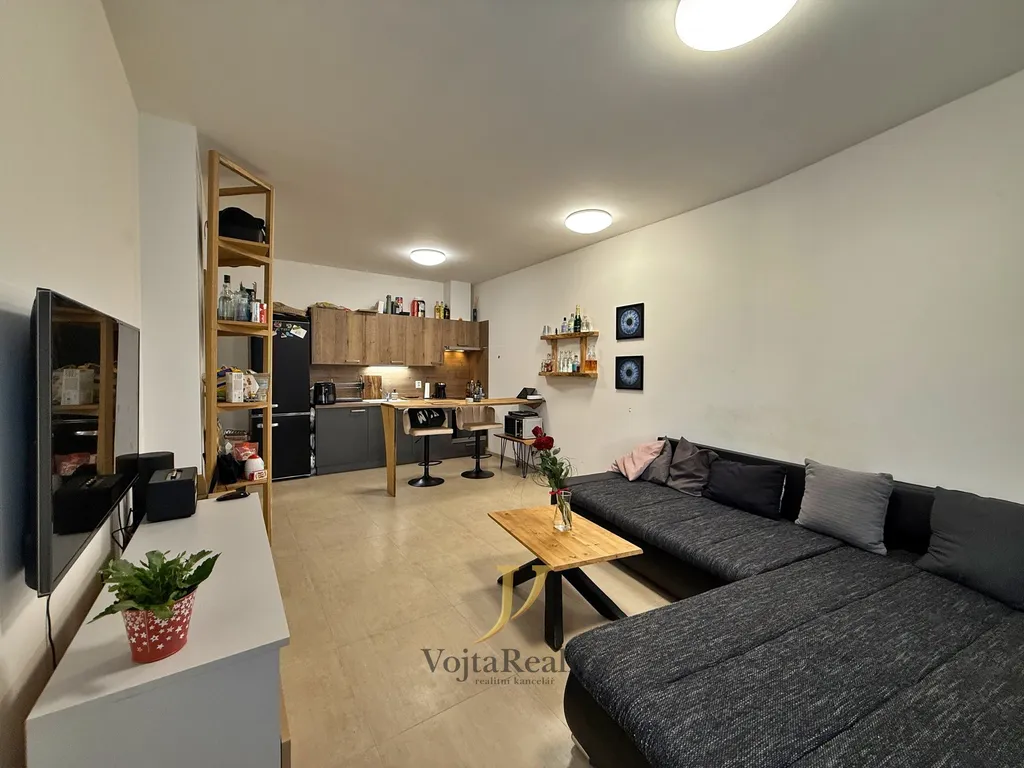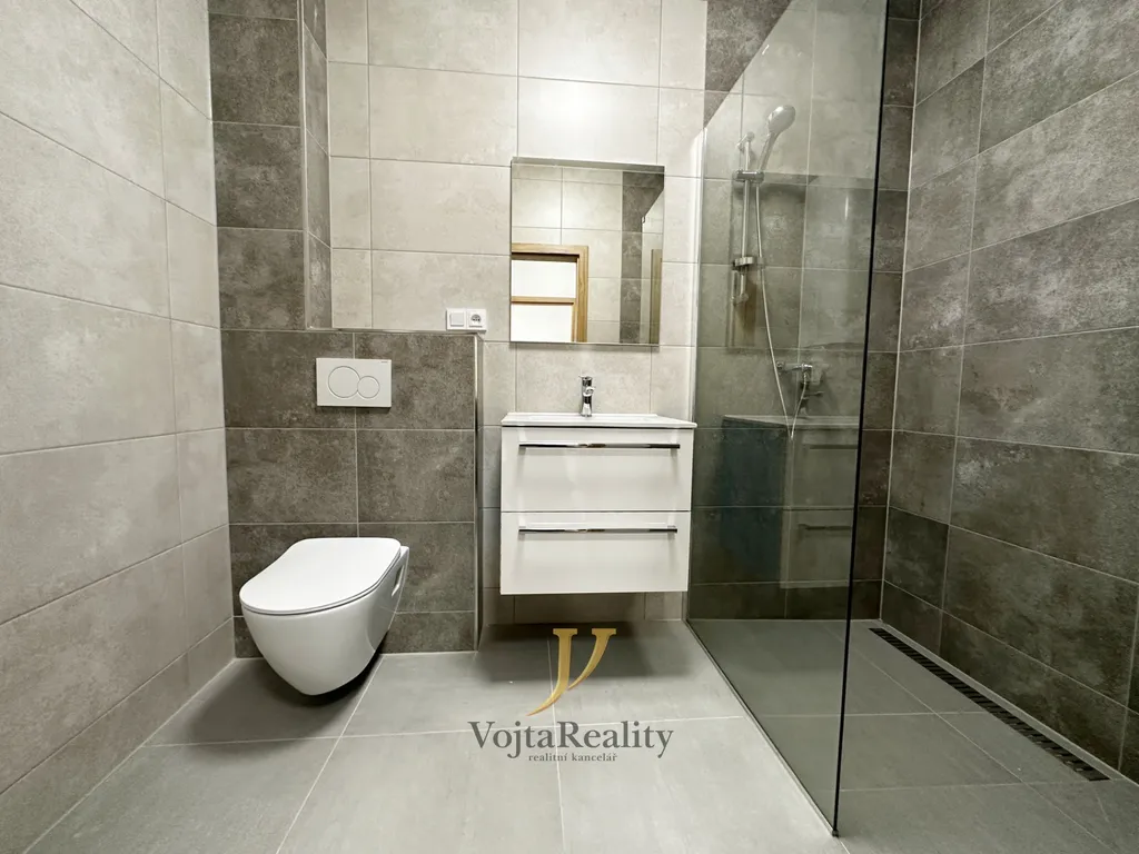 Dispozice bytu zahrnuje vstupní chodbu, koupelnu se sprchovým koutem a toaletou, světlý obývací pokoj s kuchyňským koutem a vstupem na prostornou terasu a samostatnou ložnici.