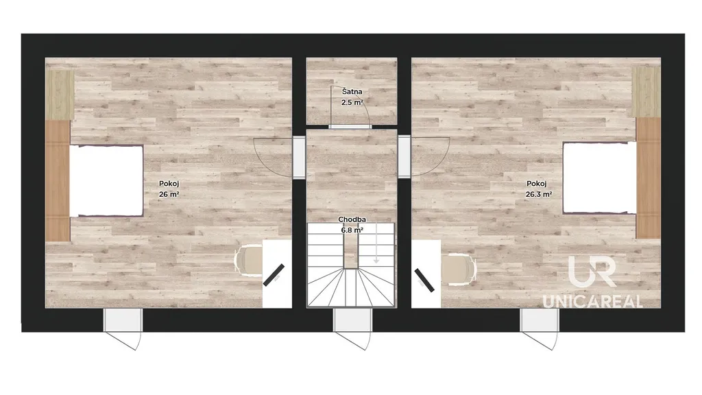 Centrálním schodištěm se dostanete do podkroví, kde jsou dva prostorné samostatné pokoje a šatna.