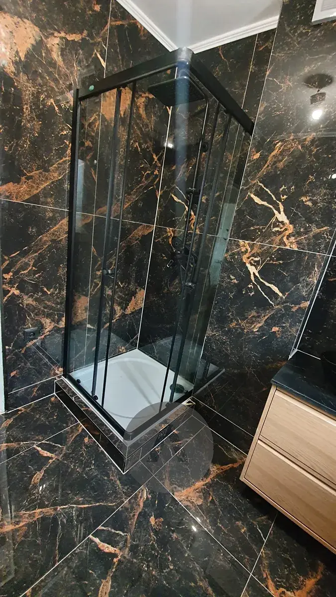 Koupelna je vybavena sprchovým koutem, umyvadlem s umyvadlovou skříňkou, zrcadlem, otopným žebříkem, a přípojkou na pračku.