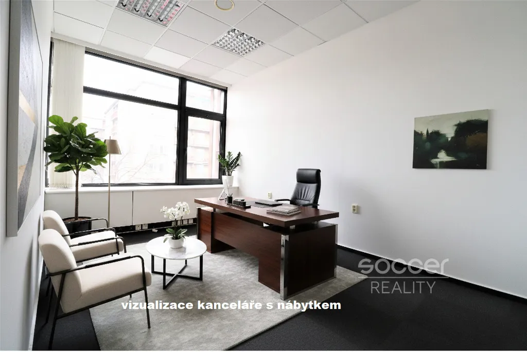 Okna kanceláře směřují do upraveného vnitřního atria s možností venkovního posezení (atrium je na fotografii u inzerátu).