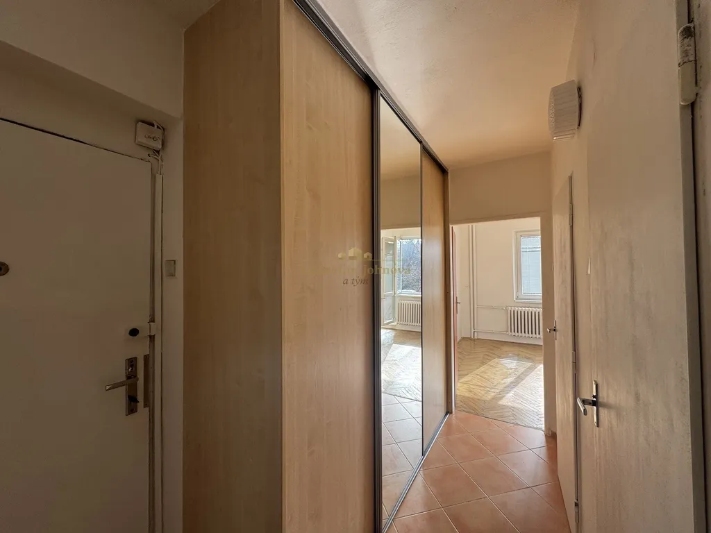 Byt prošel rekonstrukcí rozvodů elektřiny a vody, má zděné bytové jádro a je prakticky dispozičně řešen do tří samostatných místností s kuchyňským koutem. Díky své dispozici nabízí dostatek prostoru jak pro rodinné bydlení, tak pro investiční využití. Dvě samostatné ložnice jsou s orientací oken směrem na SV, obývací prostor je orientován na JZ a kuchyňský kout má okno s orientací na západ. Podlahové krytiny v pokojích jsou původní dřevěné parketové, v chodbě, koupelně a na WC je dlažba. Na chodbě v bytové jednotce je instalována prostorná šatní skříň. K bytové jednotce náleží také sklepní kóje, která poskytuje další úložný prostor.