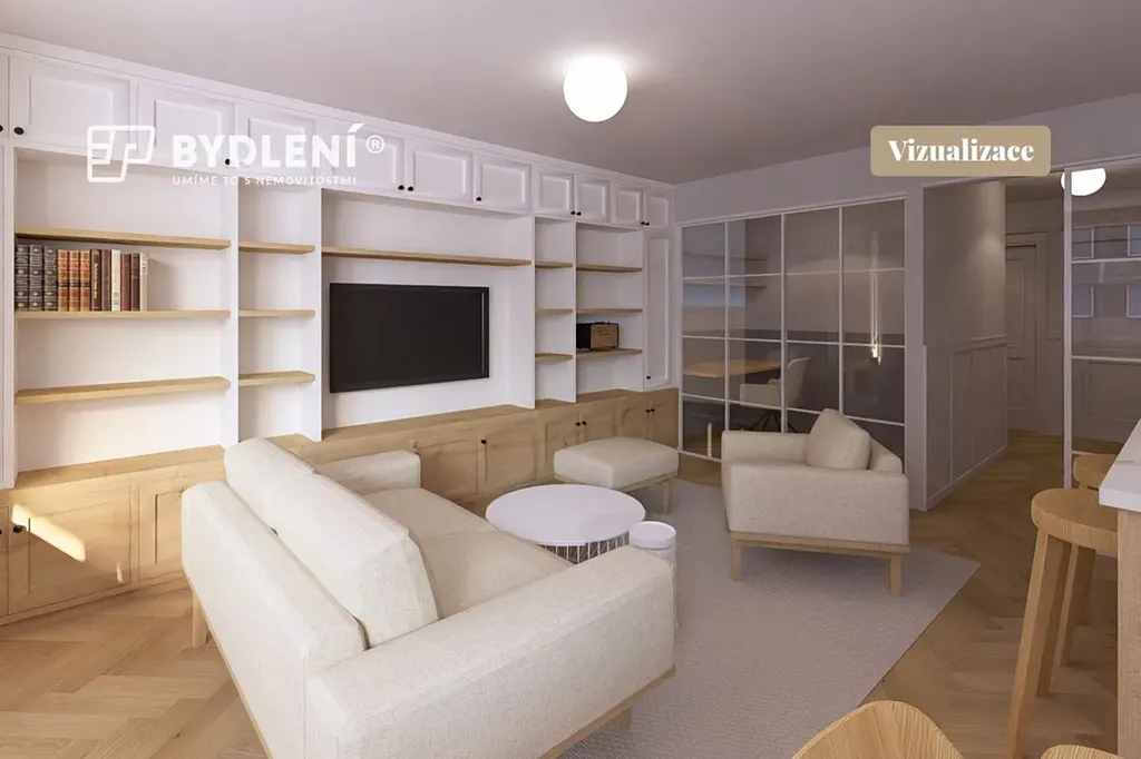 Dominantou obývací části je na míru vyrobená celoskleněná příčka s posuvnými dveřmi, která elegantně odděluje obývací prostor od pracovny, aniž by ubrala na vzdušnosti a světle. Do kuchyňské části navazují prosklené posuvné dveře s tichým dojezdem. K bytu jsou připraveny výkresy vizualizace a výkresy kuchyně, skříní a obývací stěny. Po složení rezervační zálohy lze objednat výrobu kuchyně s výběrem dekorů dle vašeho přání u našeho truhláře s dodáním do předání bytu. Cena bytu včetně kuchyně bez spotřebičů je 4 623 131 Kč. Ostatní truhlářské práce možné po dohodě.