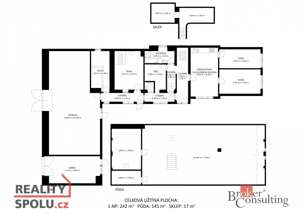 - půda (neobývaná): 145 m² – vhodná pro případnou vestavbu