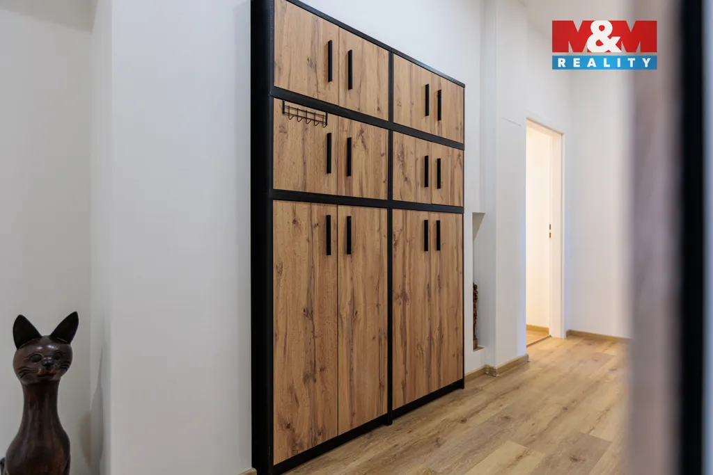 Dispozici tvoří prostorná předsíň, rohový obývací pokoj s okny na sever a západ a francouzským oknem na jediný balkon v domě, moderní kuchyně s vestavnými spotřebiči (myčka, pračka, sušička, varná deska, trouba, mikrovlnná trouba, digestoř), ložnice s velkými vestavnými skříněmi, nadstandardní koupelna se sprchovým koutem, WC a bidetem a technická místnost s boilerem. V celém bytě je elektrické podlahové vytápění a použity kvalitní materiály. Součástí ceny je kuchyňská linka se spotřebiči, ostatní nové vybavení lze odkoupit za 150.000 Kč.