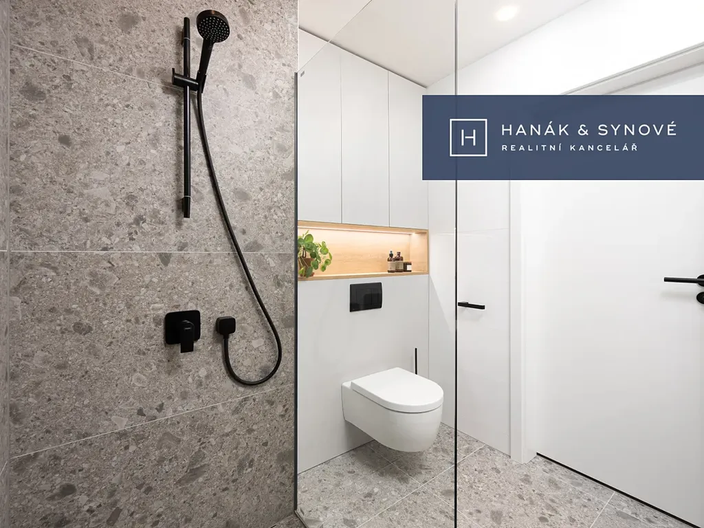Byt je zařízený ve vysokém standardu a je nabízen plně zařízený – kuchyňská linka se spotřebiči (varná deska, mikrovlnná trouba, vestavěná lednice s mrazákem, pračka se sušičkou), vestavěná skříň, postel, židle, venkovní žaluzie. Koupelna je vybavena walk-in sprchovým koutem se skleněnou zástěnou značky HÜPPE, záchodem a umyvadlem s umyvadlovou skříňkou, podsvíceným zrcadlem.