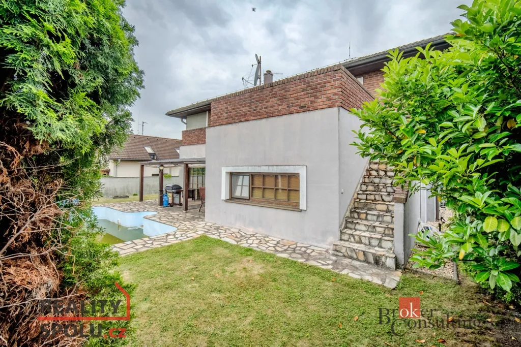 V přízemí vás přivítá prostorný obývací pokoj s krbem, na který volně navazuje jídelna s kuchyní. Celý denní prostor je propojený se zahradou – přes velká francouzská okna vstoupíte přímo na terasu s pergolou. K dispozici je zde také samostatný pokoj, ideální jako ložnice pro hosty, pracovna nebo pokoj pro člena rodiny, který preferuje bydlení bez schodů. Zahrada nabízí soukromí, dostatek místa na odpočinek i zábavu a najdete tu i bazén.