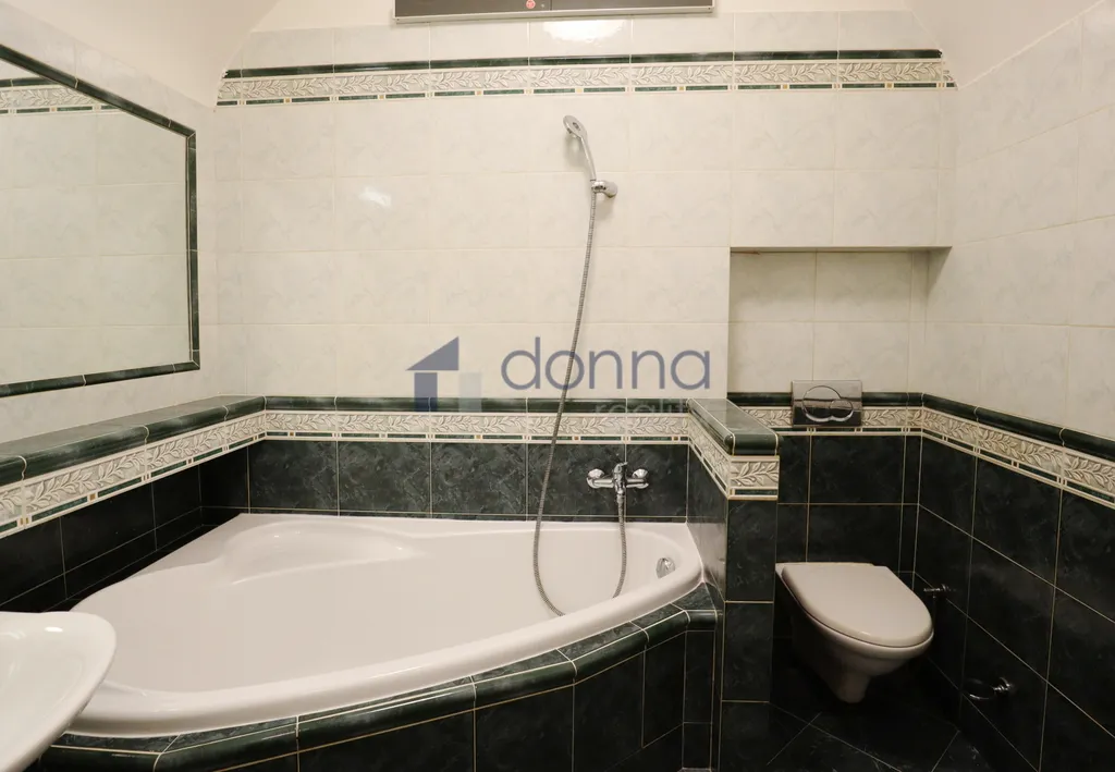 Podlahy: plovoucí podlaha a dlažba. V koupelně je vana a toaleta.