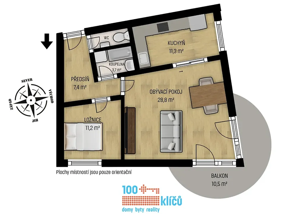 Byt se skládá z velkorysého obývacího pokoje o výměře 29 m², ze kterého se vstupuje na prostorný rohový balkon o ploše 10 m² s orientací na jihovýchod. Na obývací pokoj navazuje samostatná, plně vybavená kuchyně (11 m²) s myčkou, troubou a lednicí. Komfortní bydlení doplňuje ložnice o ploše 11 m² a koupelna s vanou a pračkou. Toaleta je oddělená. Interiér je osazen kvalitními dřevěnými podlahami a nabízí dostatek úložných prostor díky vestavěným skříním na míru v předsíni i ložnici.
