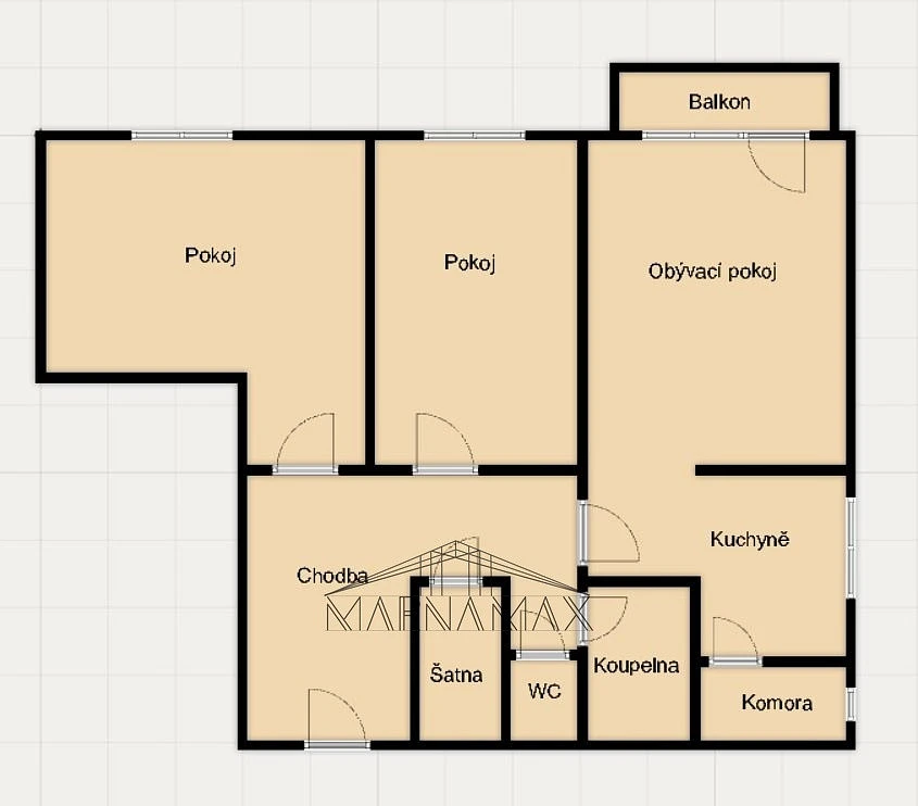 Kuchyňský kout s myčkou disponuje samostatnou komorou pro uskladnění potravin, zatímco prostorný obývací pokoj nabízí přístup na balkon, ideální pro odpočinek.
