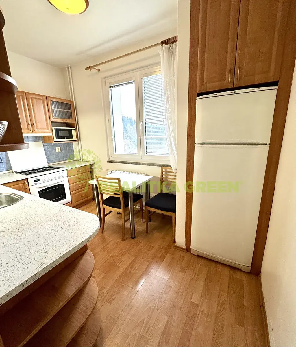 Dispozičně: prostorná vstupní chodba, kuchyň s jídelním koutem, kuchyňská linka s vestavěnými spotřebiči (plynový sporák s elektrickou troubou, myčka), obývací pokoj se vstupem na zasklený balkon, ložnice, pokoj, který lze využít jako dětský pokoj nebo pracovnu, koupelna se sprchovým koutem, samostatné wc.