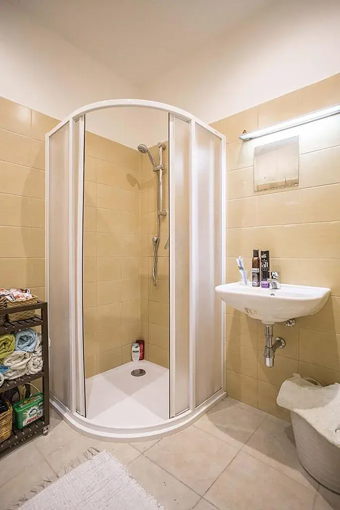 Byt má vstupní halu s vchody do jednotlivých pokojů, koupelny (sprchový kout), WC a komory.