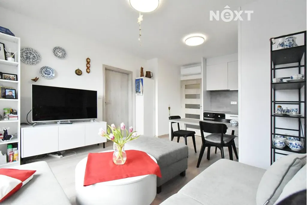 V obývací části bytu je sedací souprava se dvěma taburety, konferenčním stolkem, policemi a televizí, součástí kuchyňského koutu je jídelní stůl s židlemi kuchyňská linka s nádobím a veškeré instalované elektrospotřebiče značky Whirpool: lednice s mrazákem, pečící trouba, mikrovlnná trouba, indukční varná deska, myčka, a digestoř. V ložnici najdete velké dvoulůžko „boxspring“, komodu, noční stolky a velkou šatní skříň s policemi a pořadačem.