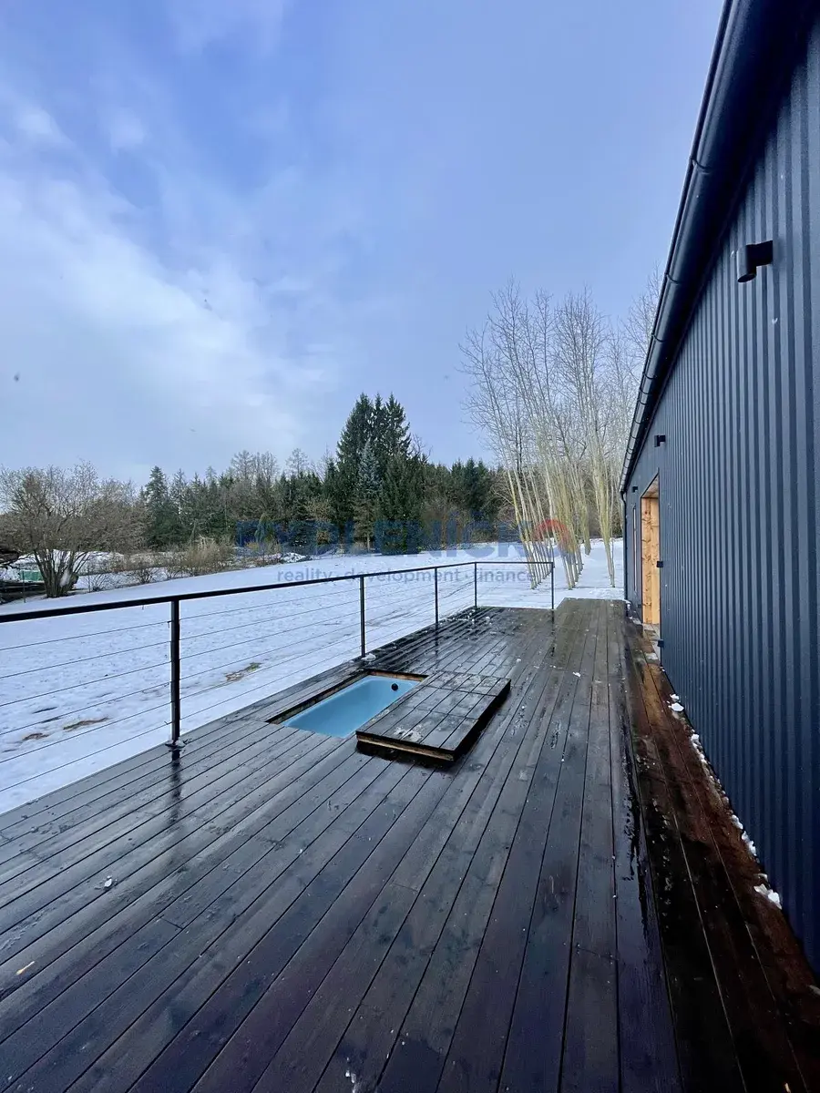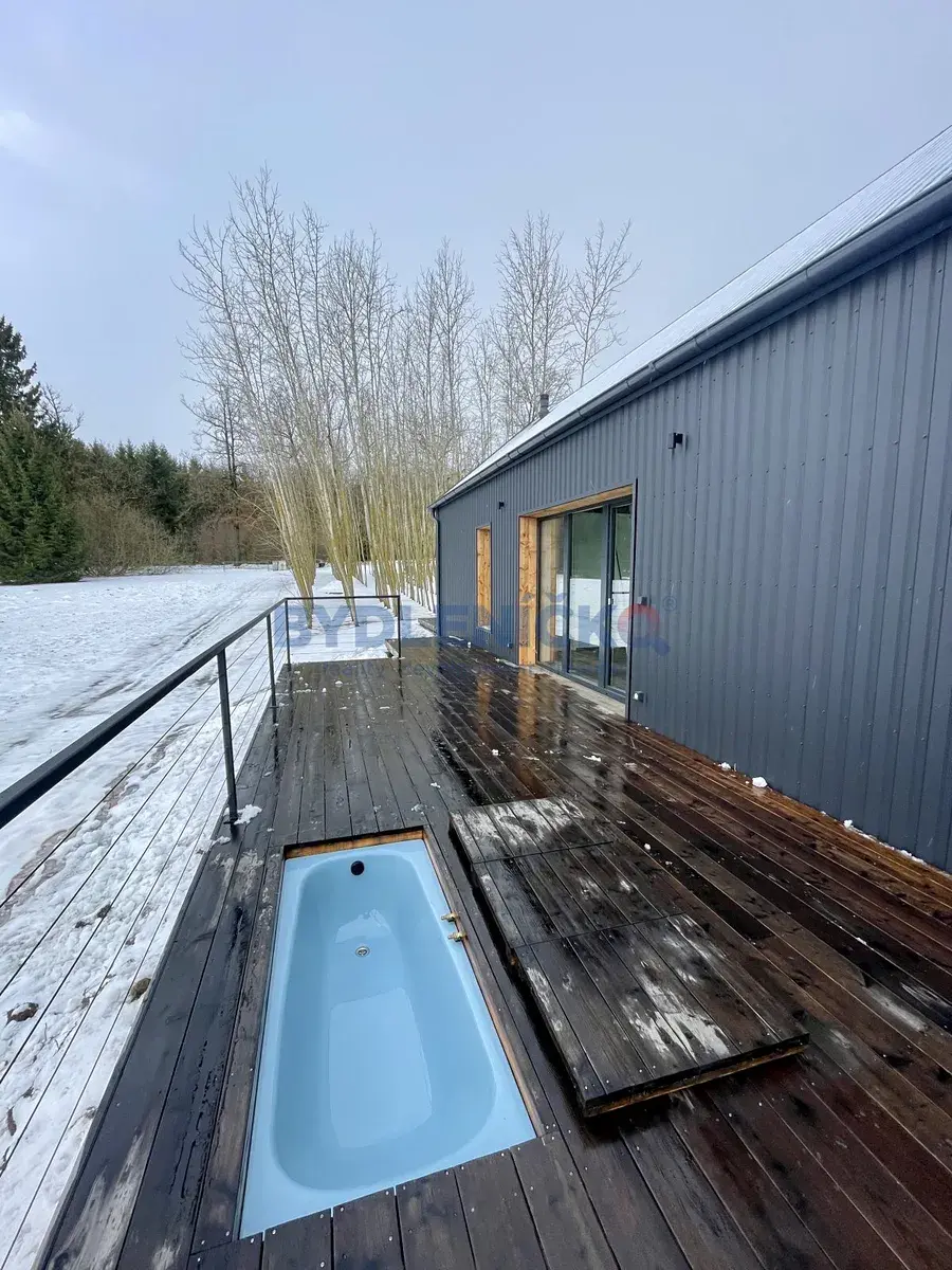 Dispozice domu je 2kk s užitnou plochou 74m2. Dům se skládá z obývacího pokoje s kuchyňským koutem, ložnice, koupelny a technické místnost. Velkým benefitem jsou dvě galerie v obytném prostoru, které lze využít například jako pracovnu, hernu, relaxační zónu nebo prostor pro příležitostné přespání. K domu taktéž náleží dvě terasy o celkové ploše 48 m², zahrada o rozloze 1 000 m² a dvě parkovací stání. Součástí terasy je také zajímavý prvek v podobě otužovací vany.