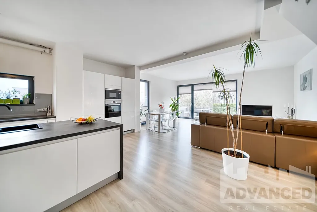 V bytě se nachází předsíň s vestavěnou skříní (4.6 m2), prostorný světlý obývací pokoj s kuchyňským koutem (52.2 m2) a vstupem na terasu (9.35 m2), z které je vstup menším schodištěm na vlastní zahrádku (56.8 m2). Kuchyně zn. Gorenje je plně vybavena (indukční deska, myčka, vestavěná trouba, mikrovlnka a lednice s mrazákem) a má úžasně velký pracovní ostrůvek. U kuchyně je technická místnost (4 m2), kde je připojení na pračku/sušičku, plynový kotel (ohřev teplé vody a topení) a praktický úložný prostor. Dále je na tomto patře samostatné WC s umývátkem (1.7 m2).