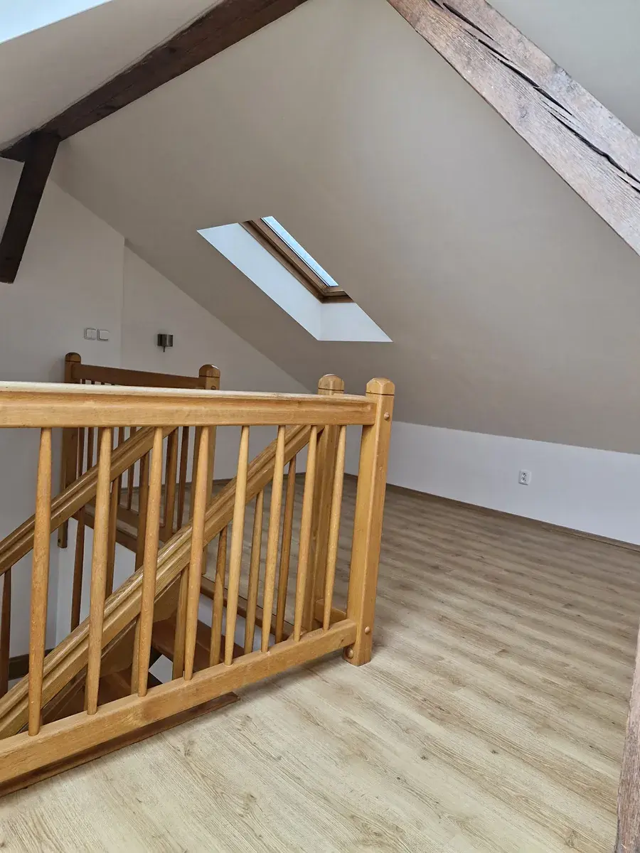 Nabízíme k dlouhodobému pronájmu světlý půdní byt 2+kk+galerie (pracovna) o celkové velikosti 95 m2 + 5 m2 sklep v udržovaném činžovním domě v Malířské ulici. Byt se nachází v 5.patře domu bez výtahu. Dispozičně je řešen: vstupní předsíň, prostorný obývací pokoj s plně vybavenou kuchyní (lednice, myčka, mikrovlnná trouba, varná deska a elektrická trouba) a schody na otevřenou galerii (23 m2), samostatná ložnice, koupelna s vanou a samostatná toaleta. V rámci koupelny je umístěna pračka a plynový kotel na topení a ohřev vody. Okna z obývacího pokoje jsou do ulice Malířské, z ložnice do klidného vnitrobloku. Místnosti jsou neprůchozí se samostatnými vstupy. V rámci předsíně a obývacího pokoje jsou vestavěné skříně. Byt je vybaven klimatizací.