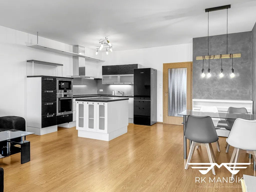 Obývací pokoj spolu s kuchyňským koutem (33,87 m²), jehož součástí jsou vestavěné spotřebiče (mikrovlnná a elektrická trouba zn. Bosch, indukční varná deska zn. Baumatix, digestoř, myčka nádobí zn. Ariston a kombinovaná lednice s mrazákem zn. Snaige), je dále doplněn středovým pracovním ostrůvkem. Z kuchyně a obývacího pokoje je vstup na příjemný balkon (7,71 m²). Obývací pokoj je vybaven sedací soupravou s konferenčním stolkem, TV stěnou s držákem na televizi, jídelním stolem s židlemi a komodou. Nechybí praktické fólie na oknech.