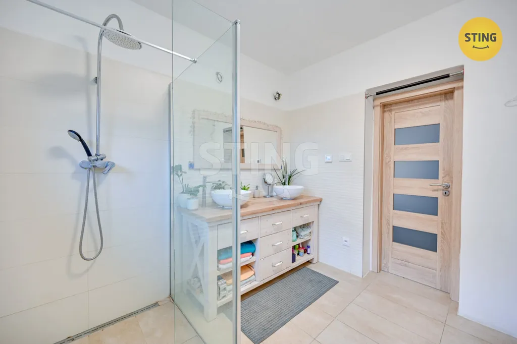 prostorná koupelna se sprchovým koutem, dvěma umyvadly, toaletou a oknem pro přirozené odvětrání.