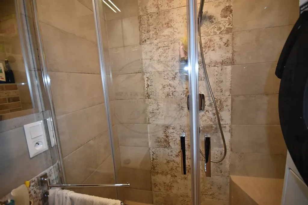 • Koupelna: Moderní sprchový kout s rohovým posezením, pračka a sušička jsou součástí prodeje, WC s bidetovou sprchou