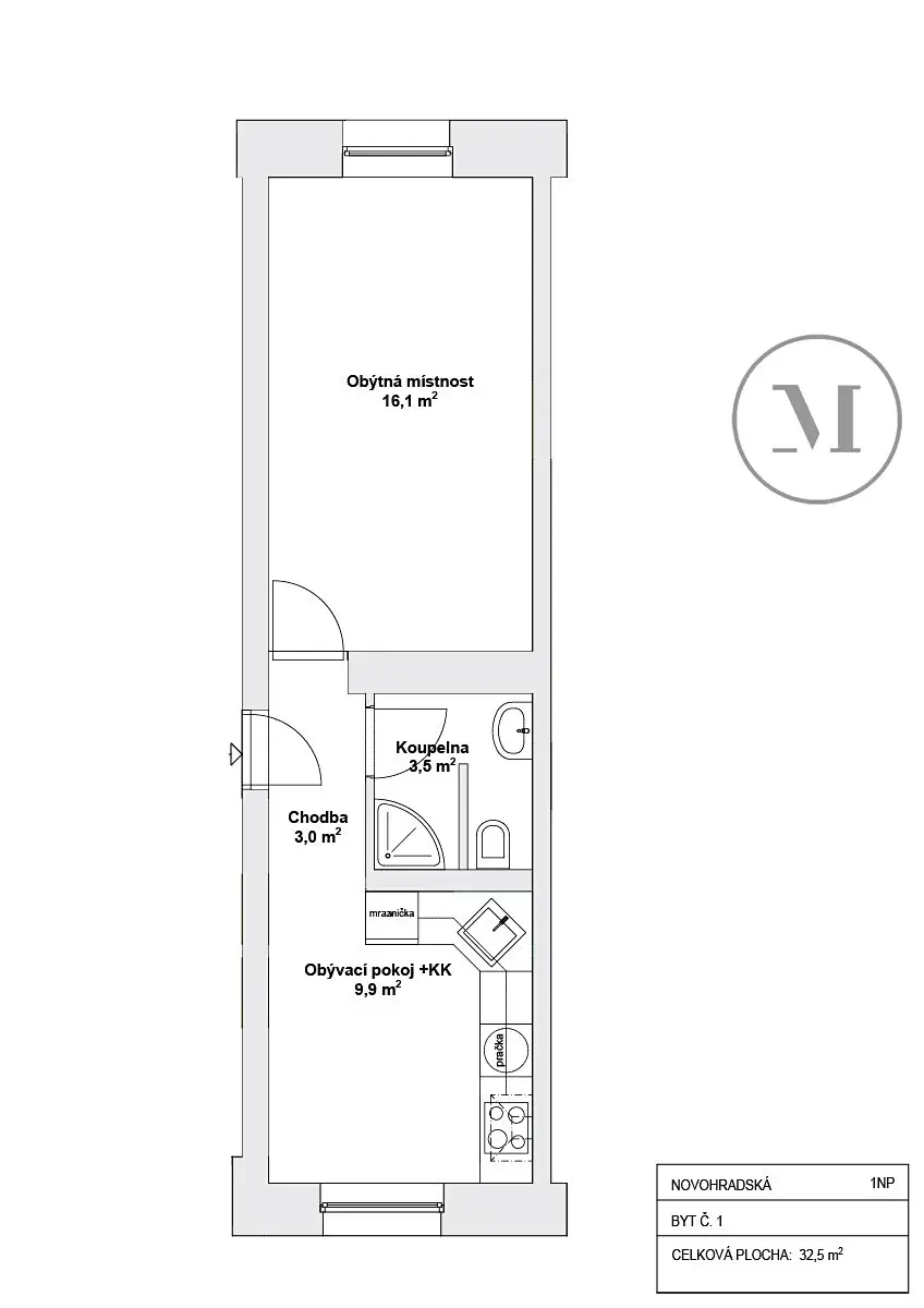 Nabízíme k pronájmu moderní bytovou jednotku č. 1 o dispozici 1+1 a celkové ploše 33 m², nacházející se ve 1. nadzemním podlaží kompletně zrekonstruovaného domu na adrese Novohradská 74.