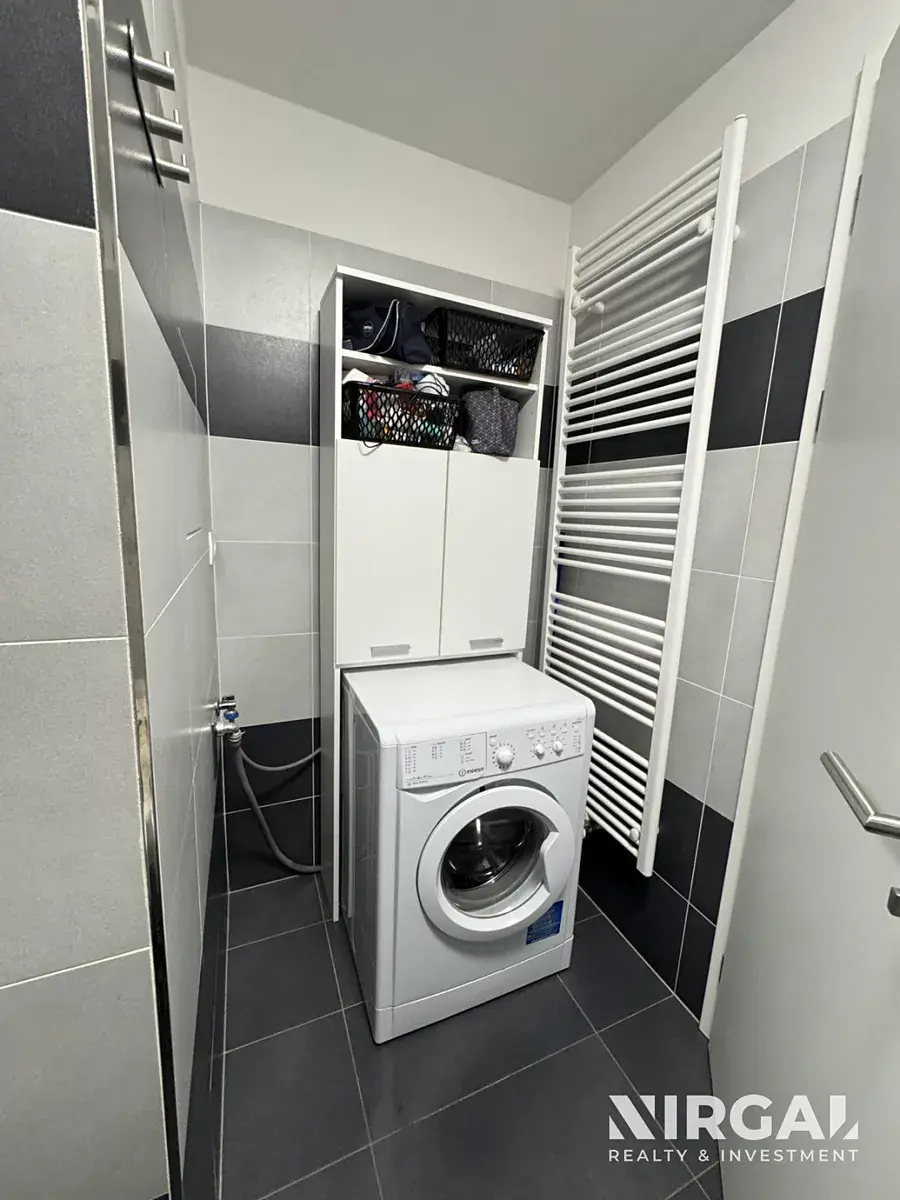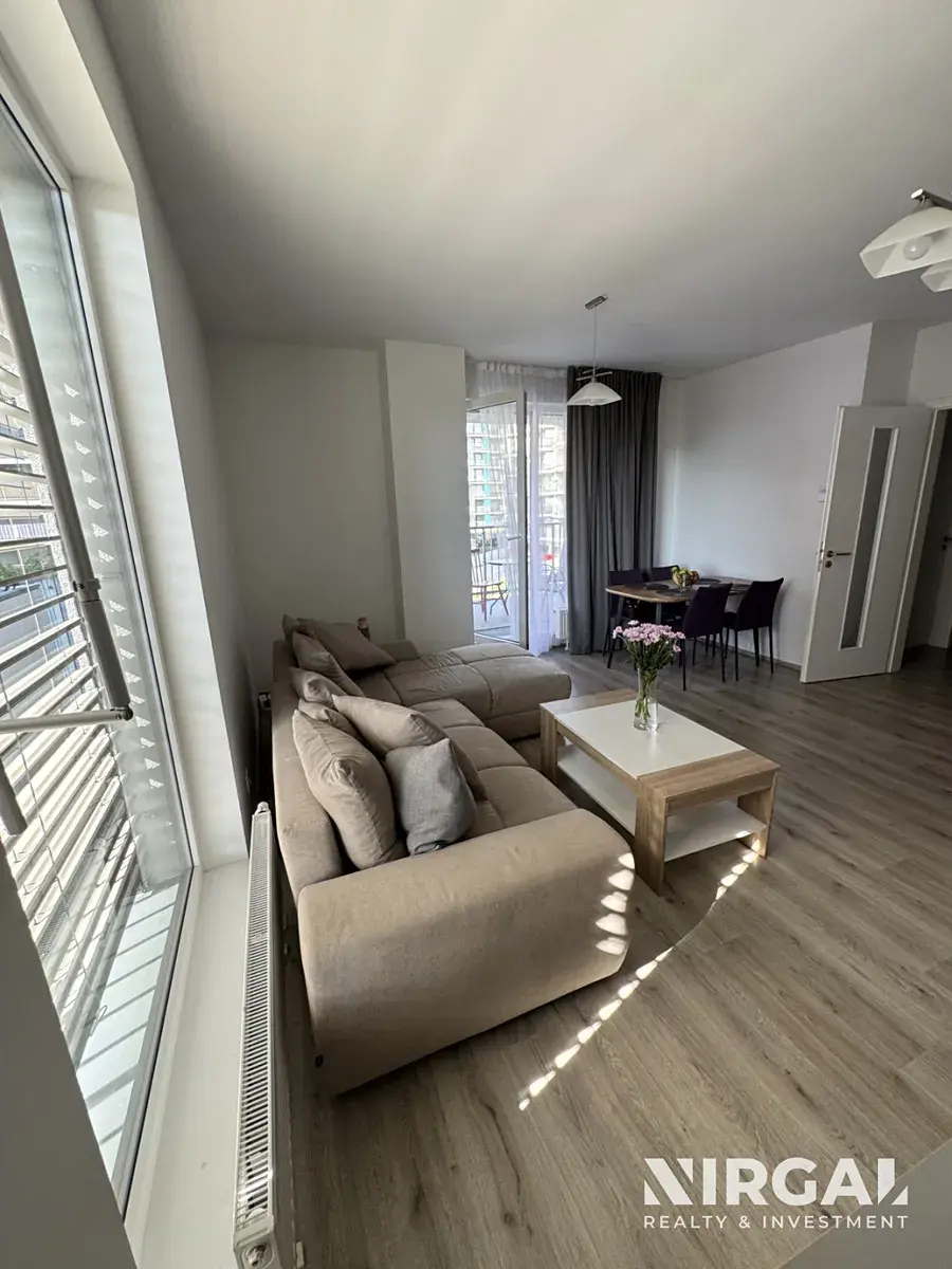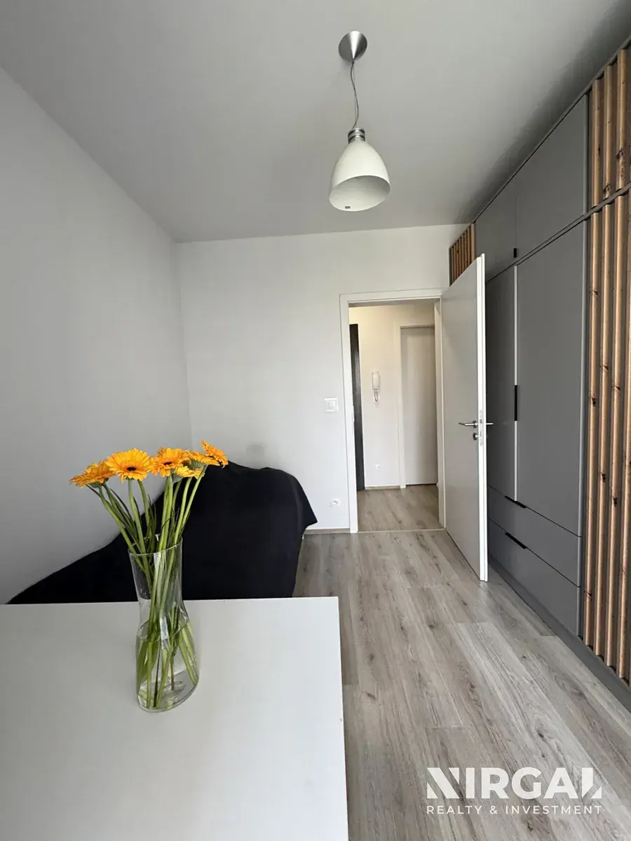 Byt se nachází ve 3. patře a tvoří ho 3 neprůchozí místnosti: světlý obývací pokoj s kuchyňským koutem a 2 útulné ložnice. Všechny pokoje mají velká francouzská okna a vstup na terasu (21 m2). Prostorná koupelna s vanou má dostatek místa i na skříňky a pračkou. Toaleta je samostatná, s vlastním umyvadlem. Kuchyňská linka je vybavená ledničkou s mrazákem, sklokeramickou varnou deskou, mikrovlnnou troubou, digestoří, troubou a myčkou.