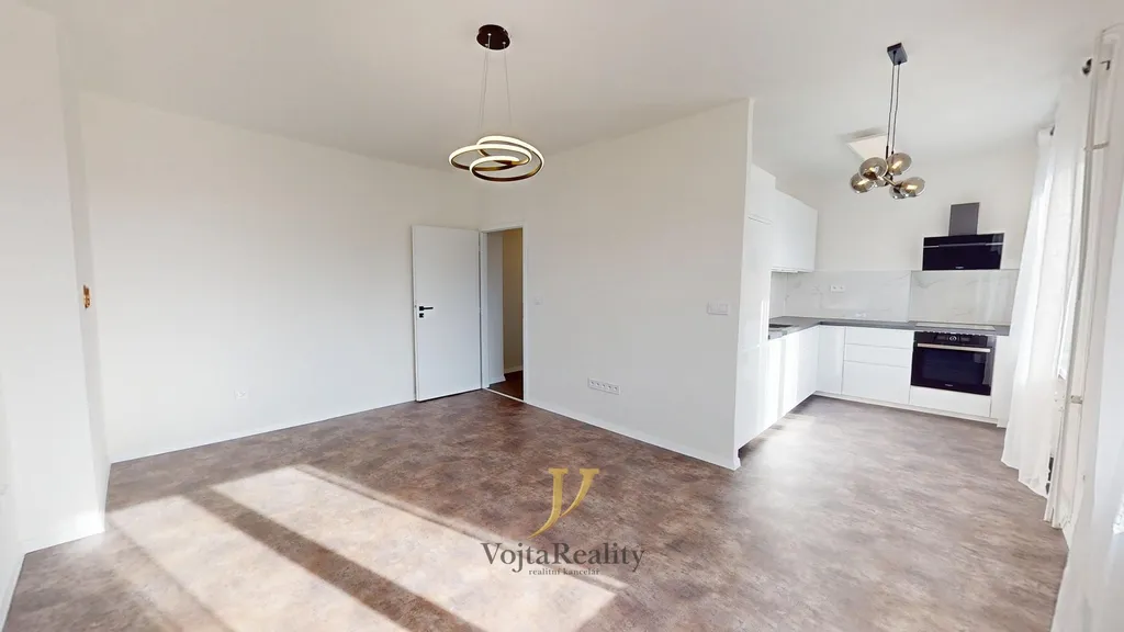 Dominantou bytu je vzdušný obývací pokoj s přípravou na instalaci krbových kamen, propojený s designovou kuchyní a pracovní deskou vyrobenou na míru. Kuchyň je vybavena značkovými spotřebiči Whirpool – indukční varnou deskou, troubou, myčkou, digestoří, lednicí s mrazákem a elegantním granitovým dřezem. Celek působí nadčasově a harmonicky.