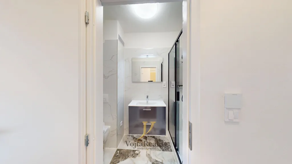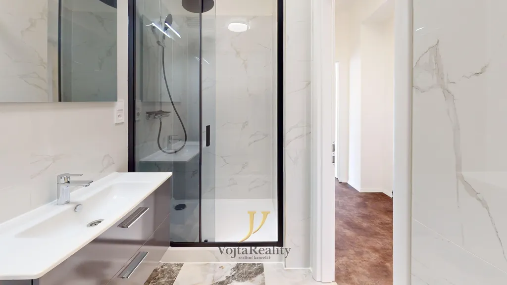 Velkoryse řešená koupelna nabízí podlahové vytápění, prostorný elegantní sprchový kout s a sladěné designové prvky. Standardem jsou kvalitní baterie a sanitární vybavení značek Grohe a Geberit, které zajišťují spolehlivost a dlouhou životnost. Vedle koupelny se nachází praktická technická místnost s bojlerem a přípravou pro pračku i sušičku.