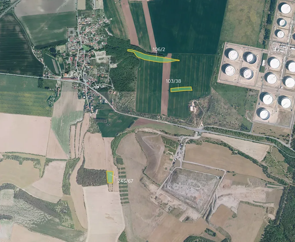 Jedná se o parcely č. 103/38, 106/2 a 245/67 o celkové výměře 25 049 m². Všechny pozemky jsou vedeny jako orná půda a tvoří jeden souvislý celek. Celá výměra je ve 100% vlastnictví a je předmětem prodeje.