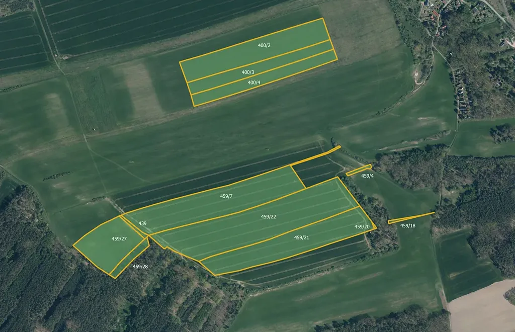 Součástí nabídky jsou následující pozemky: 379/11, 379/12, 379/19, 379/20, 379/21, 400/2, 400/3, 400/4, 439, 459/4, 459/7, 459/18, 459/20, 459/21, 459/22, 459/27 a 459/28.