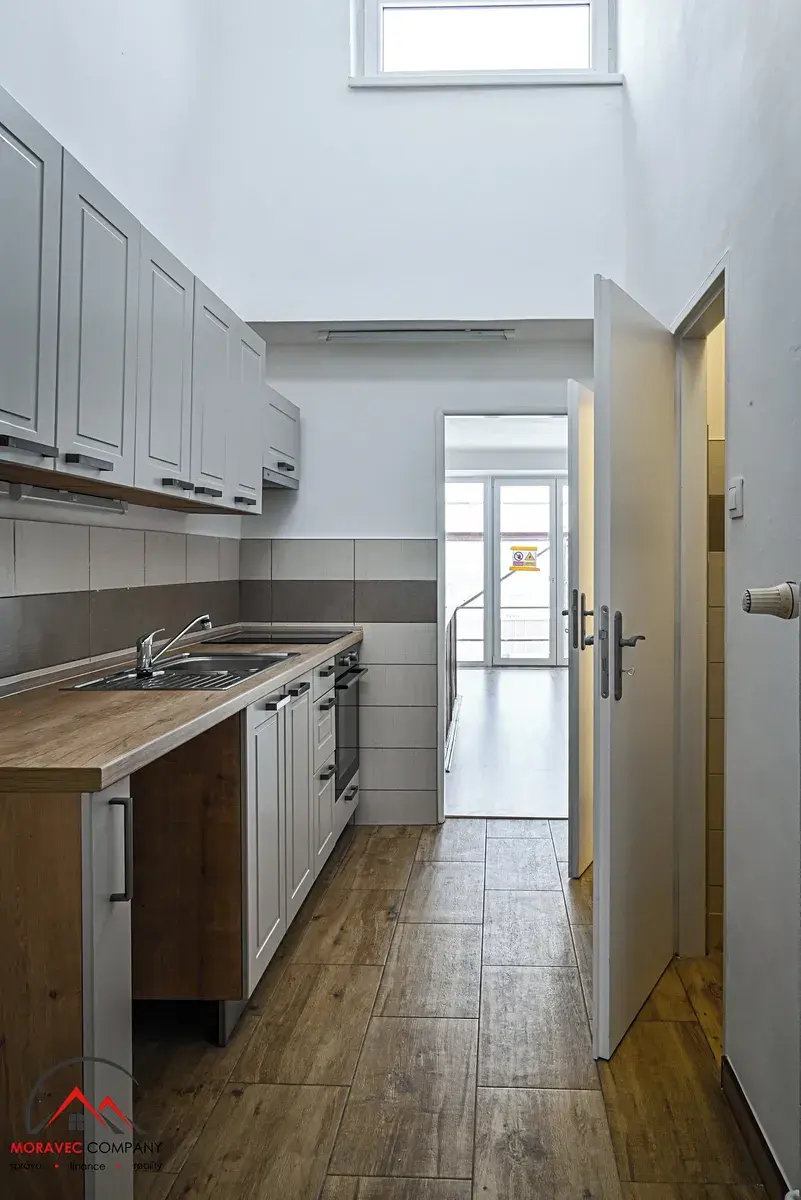 Jedná se o velmi hezký, netradiční mezonetový byt, který je vybaven novou kuchyňskou linkou s elektrickou troubou, varnou deskou a digestoří. Koupelna je vybavena vanou a praktickou skříňkou na hygienické prostředky, WC je samostatné.