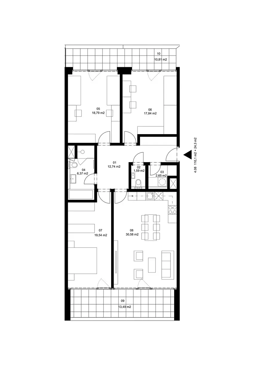 Byt zaujme velkorysou dispozicí s třemi samostatnými ložnicemi, velkým obývacím prostorem s kuchyňským koutem a přímým vstupem z každého pokoje na balkon či lodžii. Nechybí prostorná předsíň, komora přípravou pro pračku a sušičku, samostatné WC a komfortní koupelna. V koupelně najdete prostornou vanu, sprchový kout i WC. Byt tedy disponuje dvěma WC. Celková užitná plocha činí 134,4 m² včetně venkovních ploch. V každé místnosti je klimatizace se samostatným ovládáním.