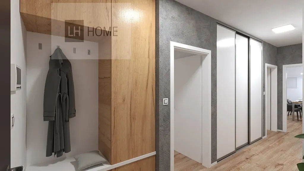 vinylové podlahy, obklady a dlažby, prostorný sprchový kout a vana, koupelnová skříňka, topný žebřík, závěsné WC, interiérové dveře, videotelefon, předokenní rolety.