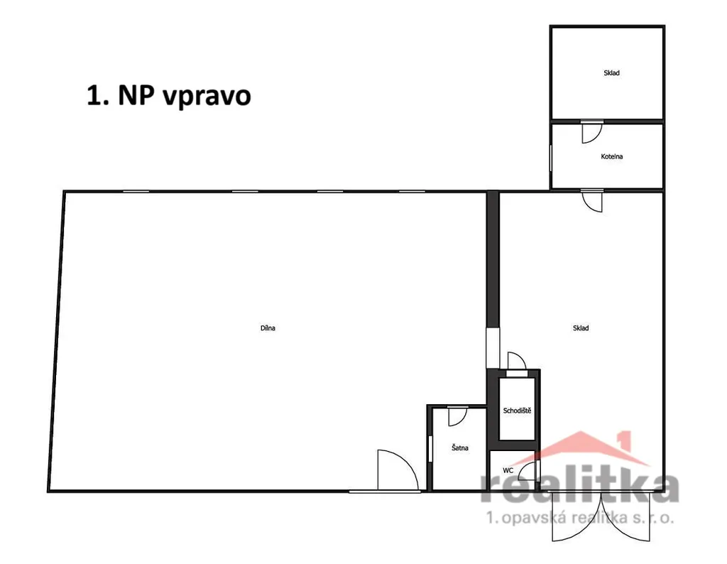 Prostorná dílna se skladem, šatnou, WC se sprchou, kotelnou a dalším skladovým prostorem. Aktuálně využíváno jako truhlářská dílna. Tato část budovy je částečně podsklepena.